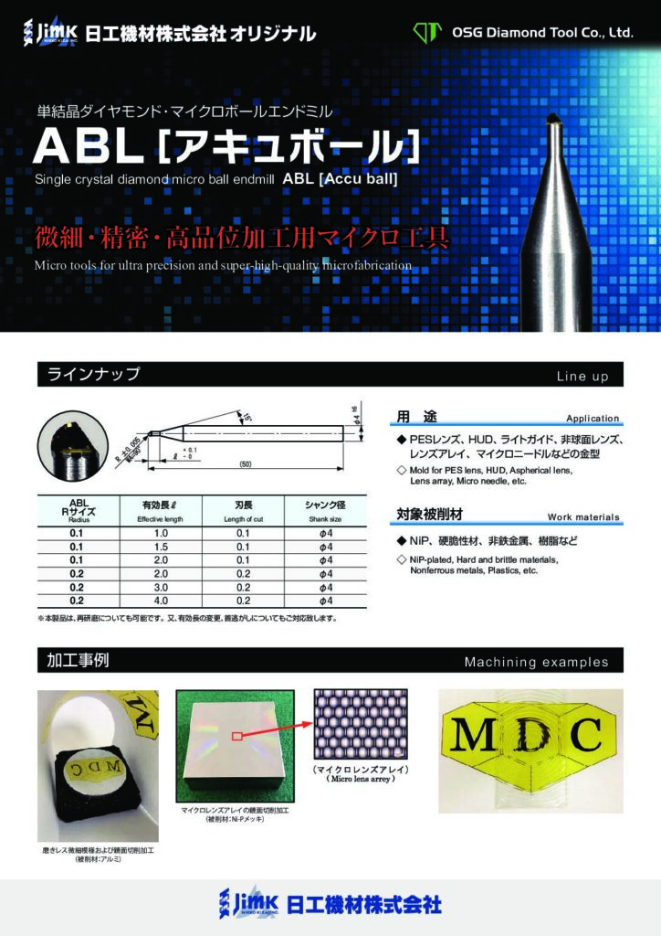 ナノメートルレベルで刃先を成形しており、数μmの切込み量となる超精密・微細加工に最適。単結晶ダイヤモンドエンドミルの鋭利な刃先と高い熱伝導性により、耐構成刃先・刃先寿命・切削熱分散に優れ、一般的なエンドミルの常識を覆します!